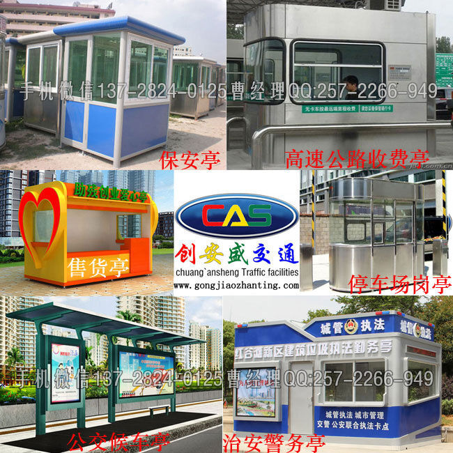 生產公交候車亭,崗亭,保安亭,高速公路收費亭,治安警務亭,售貨亭,手動欄桿機,報刊亭,公交站臺,交通安全勸導站,移動廁所,義工亭定做熱線137-2824-0125(微信同號)曹經理QQ:257-2266-949急單請加撥132-6881-4669東莞創安盛交通溫馨提示:本產品屬于非標定做產品,價格依據圖紙核算,如需準確的報價或者預算,請撥打電話直接咨詢。感謝大家的關注與合作!期待為大家帶來更多、更優質的產品、更完善的服務!如需產品樣式選型,請參考工廠網站。溫馨提示:由于本公司所有產品均由規格、配置、款式計算價格,所以一律無法在線成交,準確的價格請直接來電或者在線咨詢QQ。您要的“性價比高、優質、工期及時、全國年保、專業、周全、工藝精美”一直是我們的標準。注意:站崗亭為非標定做產品,在線無法訂購,需要與廠家溝通好“款式,規格、配置、運輸”等等方能下單。請勿直接拍。感謝關注,合作,謝謝!