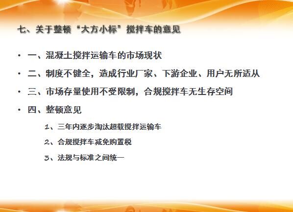 隨后,會長分析了攪拌車的市場現狀,制度不健全,造成行業廠家、下游企業、用戶無所適從,市場存量使用不受限制,合規攪拌車無生存空間;同時提出了建設性的整頓意見。