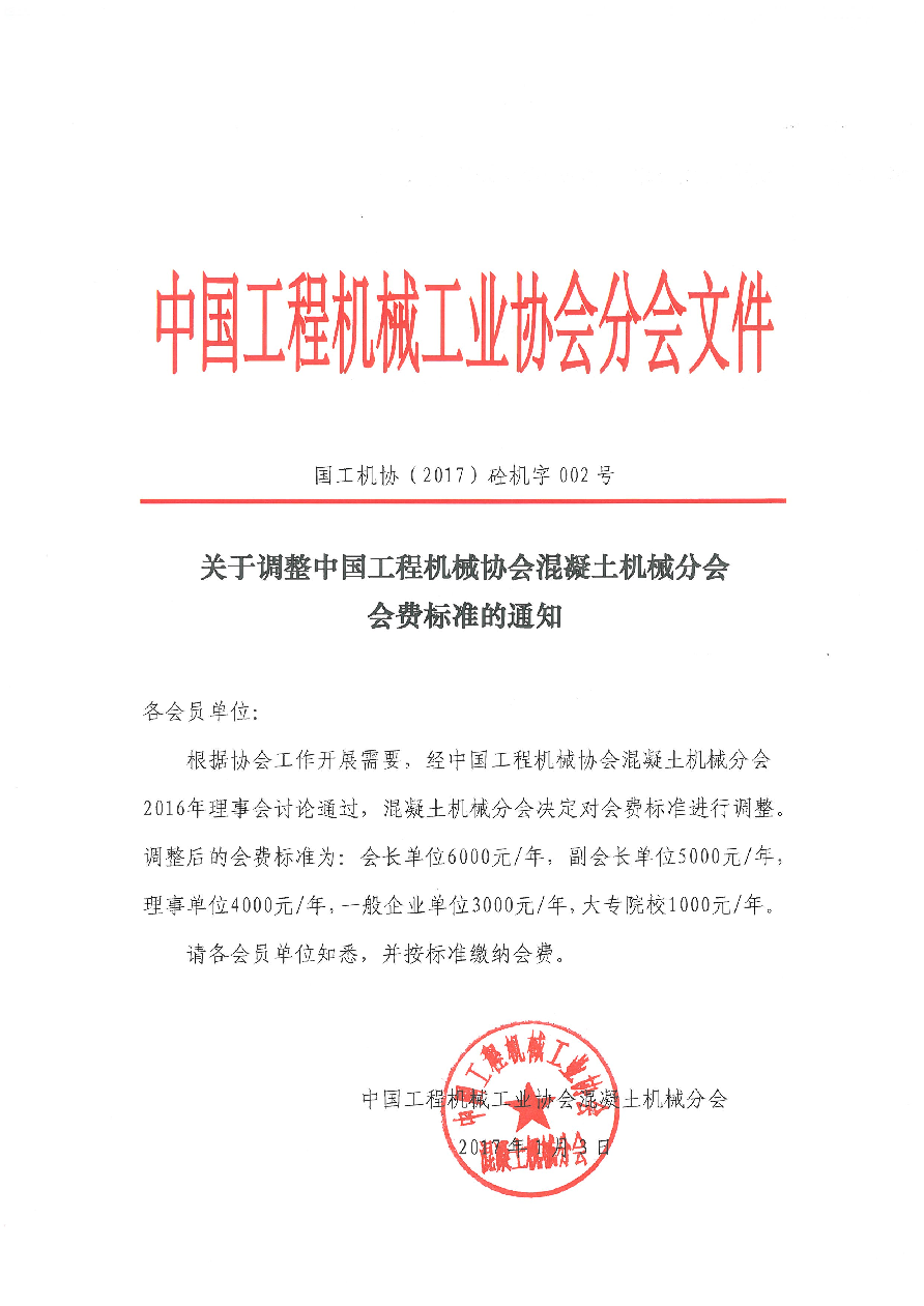關于調整中國工程機械協會混凝土機械分會會費標準的通知