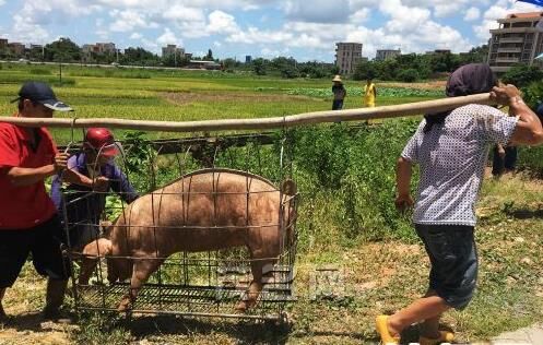 事故發生后,豬場老板叫來了另一輛貨車轉運生豬。要將一頭一兩百斤重的生豬重新裝運上車并不容易,這些受到了驚嚇的生豬顯得很不配合,需要兩三個人連拉帶拽才能把生豬趕進籠子里裝運上車。眾人用了兩個多小時才將生豬全部運走。