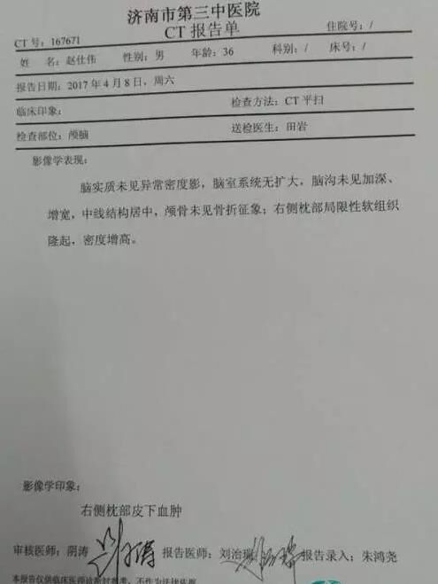 濟南市第三中醫院CT報告單顯示,趙先生右側枕部局限性軟組織隆起,密度增高。趙先生的同事周先生對記者說:“看著朋友被打成這樣,我心里很過意不去,所以我現在到醫院照顧他。”