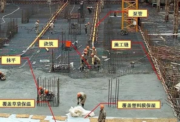 6、大體積泵送混凝土經振搗后表面水泥漿較厚,容易引起表面裂縫。首先,要求在振搗最上一層混凝土時,控制振搗時間,注意避免表層產生太厚的浮漿層;在澆搗后,必須及時用2m 長括尺,將多余浮漿層刮除,按照標高控制點,將混凝土表面括拍平整。有凹坑的部位必須用混凝土填平,在混凝土收漿接近初凝時,混凝土面進行二次抹光,用木蟹全面仔細打抹兩遍,既要確保混凝土的平整度,又要把其初期表面的收縮脫水細縫閉合,在混凝土收漿凝固施工期間,除了具體施工人員外,不得在未干硬的混凝土面上隨意行走,收漿工作完成的面必須同步及時覆蓋薄膜。