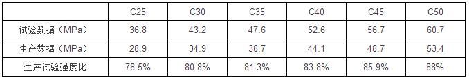 注:試驗數據為三個月內6次配合比試驗強度的算術平均值;生產數據為同配比連續生產三個月留置標準試件抗壓強度的算術平均值。