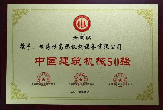 近日,“2017中國建設行業領袖峰會”暨2016年度“金筑獎”頒獎盛典在北京召開,珠海仕高瑪機械設備有限公司在2016年全國建筑業“金筑獎”評選活動中,榮獲“中國建筑機械50強”、“中國建筑機械混凝土機械十強企業”稱號。
