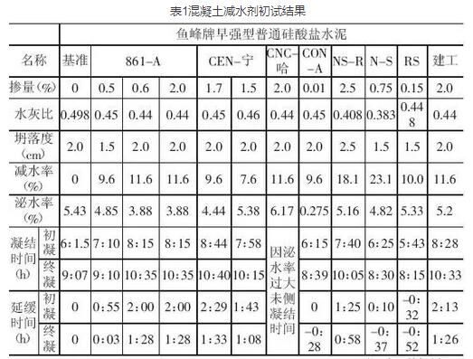分別準確稱取水泥300g、減水劑300g及水300g,按規范方法,將水、減水劑及水泥凈漿進行拌和。在干凈的玻璃上將拌和好的水泥講講裝入試模中,將試模逐次提起后,對水泥凈漿的流動情況進行觀察,并對水泥凈漿的流動性能進行測試,看其能否滿足混凝土泵送要求。同時,對不同的水泥、不同的減水及減水率大小及摻量進行記錄,然后優選,如表1所示。