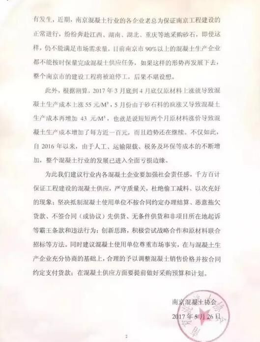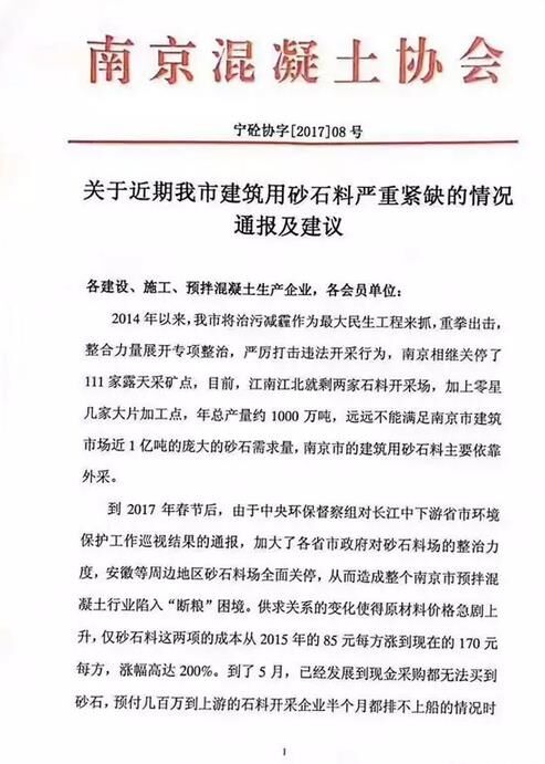 5月26日,南京混凝土協(xié)會關(guān)于近期南京市建筑用砂石料嚴(yán)重緊缺的情況發(fā)布通報及建議。公告中提到:目前江南江北僅剩的兩家石料開采場遠(yuǎn)遠(yuǎn)不能滿足南京市建筑市場近1億噸的砂石需求量,全市建筑用砂石料主要依靠外采。尤其是在今年春節(jié)以后,中央環(huán)保督察組對長江中下游省市環(huán)境保護(hù)巡視結(jié)果的通報,加大了各省市政府對砂石料場的整治力度,周邊地區(qū)砂石料場全面關(guān)停,從而造成全市預(yù)拌混凝土行業(yè)陷入“斷糧”的困境,這也直接導(dǎo)致原材料價格急劇上升。