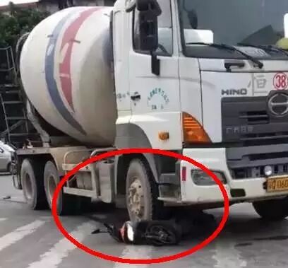 在不遠處,停放著一輛大型攪拌車,右前輪下壓著一輛電動車。附近居民稱,事發時,女子所騎的電動車與攪拌車發生碰撞,導致慘劇發生。