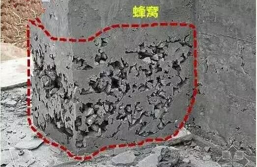 蜂窩有表面的、深井的和貫通的三種,也常遇到水平的、傾斜的、斜交的單獨蜂窩和相連的蜂窩群,其表現為局部表面酥松,無水泥漿,粗骨料外露深度大于5mm(小于混凝土保護層厚度),石子間存在小于最大石子粒徑的空隙,呈蜂窩狀,有蜂窩處的混凝土強度很低。