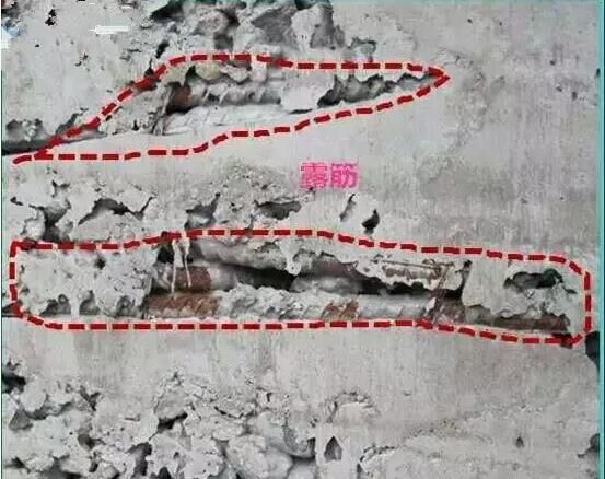 在鋼筋混凝土澆筑過程中振搗不到位,保護層墊塊沒有設置或者固定不牢固,混凝土坍落度小,或拆模早,混凝土硬化前受外力導致剝落而使構件成型后鋼筋外露的現象。