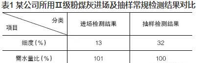 優質的粉煤灰摻入混凝土可明顯地改善混凝土的和易性,當粉煤灰摻量大于膠材總量的5%~10%時,效果極為明顯。現今在混凝土實際生產中,粉煤灰摻量往往達到20%,有的甚至高達30%,但混凝土的和易性卻不盡人意。抽取原材料進行檢測時,發現粉煤灰的檢測結果經常不滿足標準要求或者與驗收時的結果相差甚遠?,F以某公司所用Ⅱ級粉煤灰進場及抽樣常規檢測結果進行對比,見表1。
