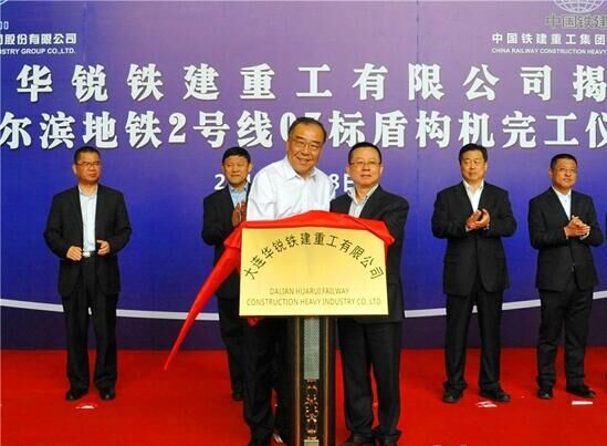 5月8日,中國制造業兩個“巨頭”的雙手緊緊握在了一起,他們分別是鐵建重工董事長劉飛香、大連重工董事長叢紅。兩位董事長共同出席在大連重工·起重集團泉水研制基地舉行的“大連華銳鐵建重工有限公司揭牌暨哈爾濱地鐵2號線7標盾構機完工儀式”,并高興地一起為“大連華銳鐵建重工有限公司”揭牌。