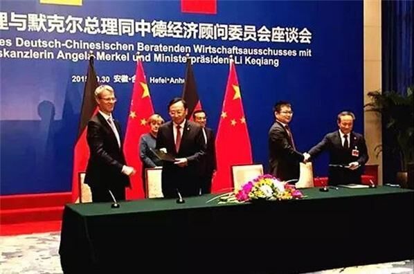 在李克強、默克爾總理的見證下,徐工和SAP公司簽訂了戰略合作項目協議。(照片右一為徐工董事長王民)