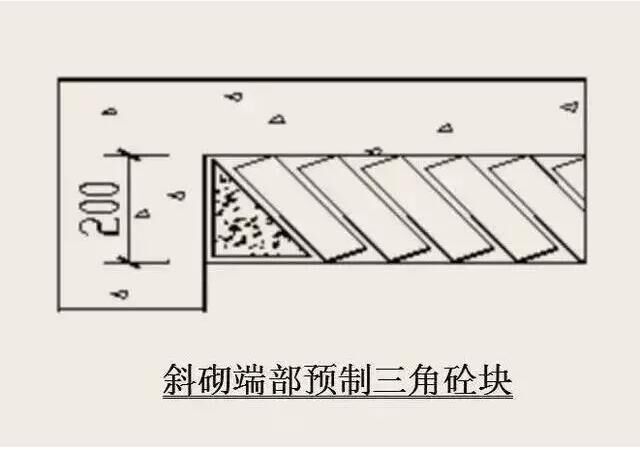6)砌體頂部斜頂磚要求:砌到接近上層梁、板底約200mm,浮磚壓頂待下部砌體沉縮。在抹灰前(間 隔時間不少于14天),宜用實心磚斜砌擠緊,磚傾斜度為60度左右,砂漿應飽滿,如圖所示: