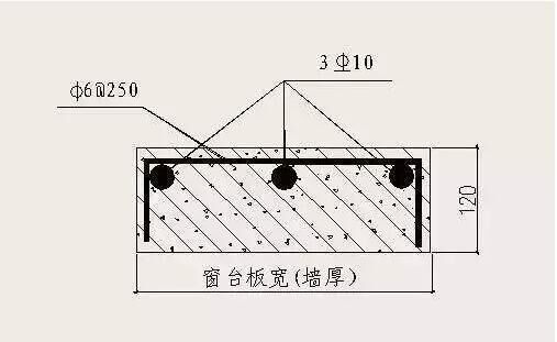 對于砌體墻,外窗洞下口必須澆筑寬與墻厚相同、高度不小于120mm、長度每邊伸入墻內不少于400mm(不足400mm時通長設置)的混凝土窗臺板(針對窗臺下砌體八字縫措施),已設鋼筋混凝土凸窗套或窗臺板者除外。窗臺板為C20混凝土,內配3Φ10主筋和φ6@250U型分布筋。