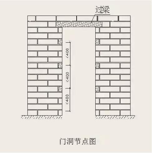 當內墻為砌體時,應沿門洞口兩側,采取灰砂磚或水泥磚或C20混凝土預制塊,以每隔500~600mm間距替換加氣磚;門洞兩側自離地500起,采取灰砂磚或水泥磚或C20混凝土預制塊。