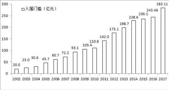中國企業500強的入圍門檻及增幅(2002-2017)