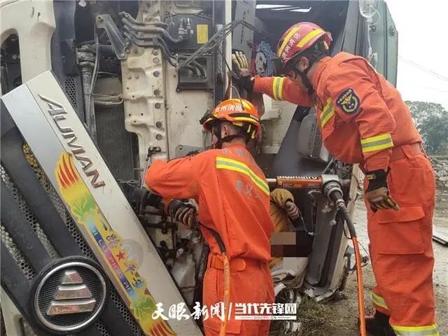 到達現場后,指揮員立即下車對現場情況進行偵查,發現事故車輛是一臺裝滿了35噸混凝土的罐車,由于雨天路滑,司機行駛到一段下坡路時因操作不當發生側翻。駕駛員被困在駕駛室內,駕駛室已嚴重變形,無法將車門正常開啟,現場醫護人員正為司機輸液補充能量。