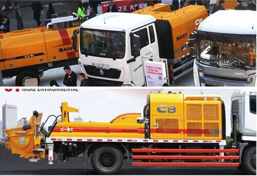 三一HOWO國(guó)Ⅳ排放標(biāo)準(zhǔn)單動(dòng)力車載泵(無(wú)上裝動(dòng)力)是bauma展覽會(huì)上展出的唯一一臺(tái)車載泵。配置單一動(dòng)力和進(jìn)口分動(dòng)箱,從而節(jié)約了一臺(tái)上裝泵送柴油發(fā)動(dòng)機(jī),是該車的最大亮點(diǎn)。該車載泵柴油機(jī)功率為206kW,6.87L排量,配置400L大油箱,混凝土理論輸送壓力10/20MPa,理論輸送量115/60m3/h。