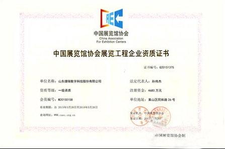 2015年5月28日,山東捷瑞數字科技股份有限公司順利通過中國展覽館協會的審核,正式被認定為中國展覽展示行業最高資質:展覽工程企業一級資質,并獲得中國展覽館協會頒發的資質證書。