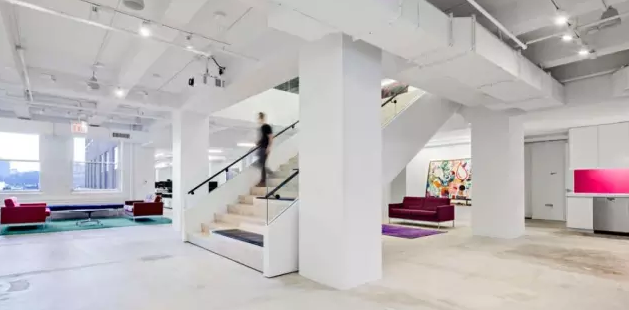 辦公空間大面積采用混凝土材料整體地坪,與現代風格的軟裝相互搭配,偶爾點綴期間的鮮活色彩,在整體純色空間形成對比,粗獷與精致相互交融,打造出全然開放通透、時尚簡約的空間環境。