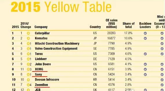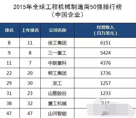 2015年全球工程機(jī)械制造商50強排行榜中國企業(yè)榜單