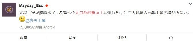 最后,還有趁機找理由的!我去,火星上發現水了?看來火星人、火星文都不是白說的!你們造嗎,將來有一天和火星人溝通,這光榮和艱巨的任務就落在我們身上了,這專項技能,可不是隨便來個人就有的啊!