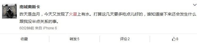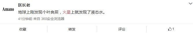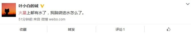 還有那腦洞特別大的。地球上剛發現個葉良辰,火星上就發現了液態水。這倆的聯系在哪兒?難道說,我們良辰哥哥原來是“來自星星的你”……嗯,這就能解釋為什么他說的話看上去不像是地球上的正常人了,原來是真實版的都敏俊xi出現了!