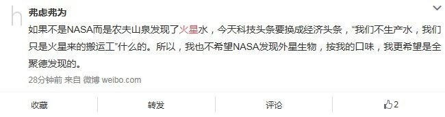 趁機自黑也是個好選擇。火星上都有水了,我腦袋進水怎么了?這還真是讓人無從辯駁……就是別讓商家學去了:火星上都有水了,我的雨傘漏水怎么了?火星上都有水了,我這豬肉注水怎么了?怎么了?
