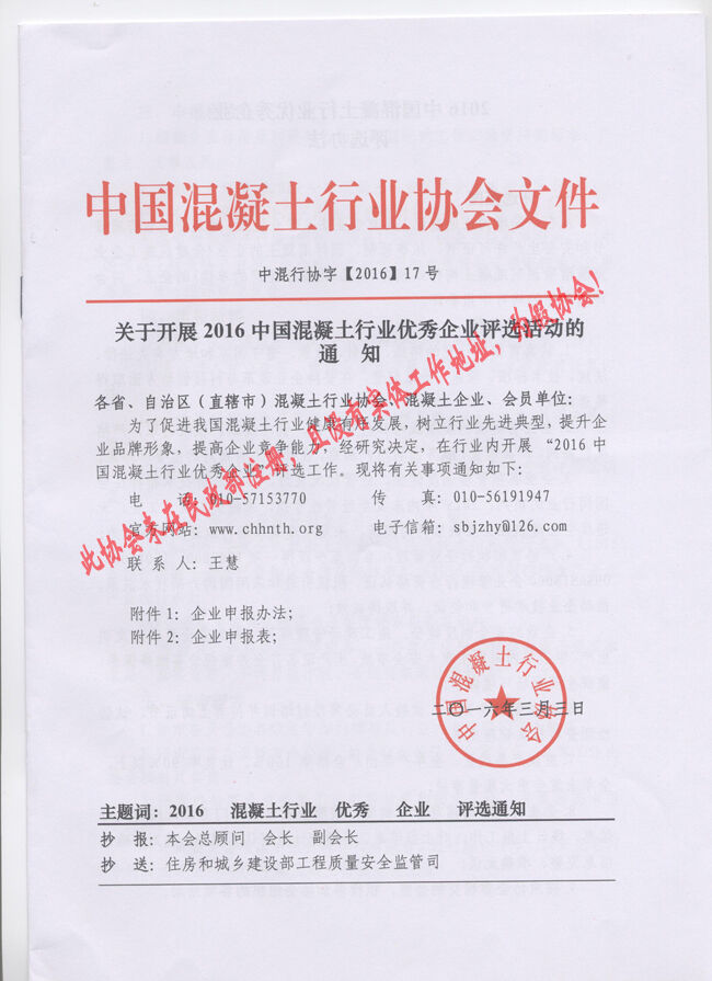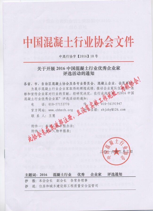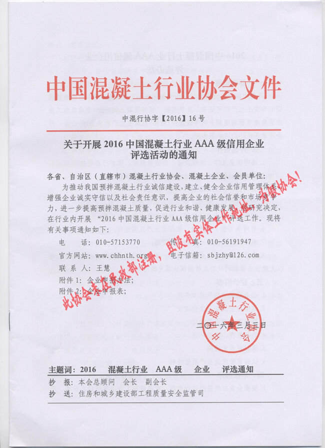 近日,有多家省市協會和有關生產企業向分會秘書處反映收到“中國混凝土行業協會”2016(16、17、18、19、20)文件開展所謂的“中國混凝土行業評選活動”的通知。