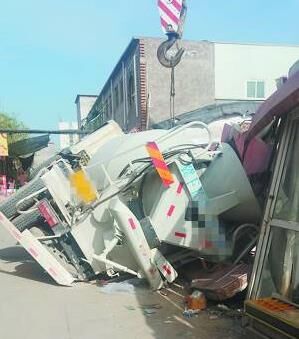 一輛江淮標志的白色攪拌車在吊車的牽引下斜靠在墻上。據目擊者介紹,事發下午1時左右,當時攪拌車正在倒車,突然車右后輪下方的路面塌陷,攪拌車失去平衡,向右方翻倒,有兩名路過此地的行人躲閃不及,被壓在了車身下。