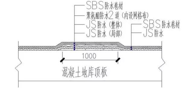 頂板混凝土養護后,冷縫處混凝土加強處理,設置防水附加層,為了保障地庫頂板防水效果,現場在冷縫處1m范圍進行防水附加層,具體做法如下: