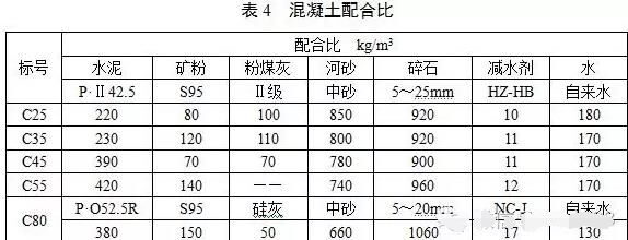 各標號混凝土工作性能良好,坍落度在180mm~210mm之間,無離析、泌水現象,各標號混凝土配合比如表4所示。