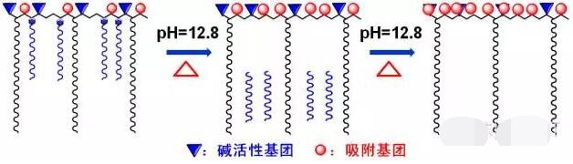 其次,快速水解型聚醚單體應用,由于水泥水化前期速度較快,自由水消耗較多,在低自由水量前提下,通過調控水解釋放速率與側鏈脫落、水化掩埋之間的平衡,既有效降低前期流動度損失,又避免后期反向增長。快速水解提供分散動力作用示意圖如下: