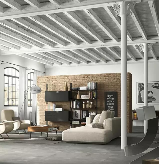 水泥灰的瓷磚,白色吊頂及墻面,營造出一種略微冰涼不近人情的工業氛圍,空闊粗糙的設計感,組成一個有著極大吸引力的家居風格。