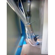 將膩子粉包裝袋套在出料嘴上,撥動彈簧開關,壓袋氣缸開始工作并壓住袋口,控制器將包裝袋重量自動去除,通過空壓機的氣流經三分管分成三路,其中一路去往進料口進行破拱,保證下料暢通。葉輪高速轉動迅速將物料撥出灌入袋中,隨袋中空氣一起溢出的粉塵經排氣孔排出(對環保要求高的用戶也可連接吸塵器,由除塵器吸走)。待加料達到粗流設定值(L1)時,氣缸自動將橡膠軟管夾至1/2開口,出料速度減慢,到總設定(L2)時,氣缸將橡膠軟管完全夾死,出料停止,壓袋氣缸松開袋口,灌裝結束。