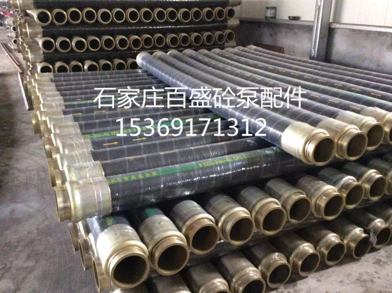 特點:。高壓混凝土泵膠管,4層鋼絲,內層加厚,高壓,高耐磨,長壽命,防脫皮,防掉頭泵車膠管,混凝土泵膠管,樁機膠管,混凝土輸送泵膠管。通用于混凝土輸送泵膠管,泵車膠管,樁機膠管,正常使用不低于10000方。低壓混凝土輸送泵膠管,2層加粗鋼絲,常規內層耐磨橡膠,主要用于低壓混凝土泵尾端或泵車尾端膠管。正常使用不低于8000方。但是市場上偽劣混凝土泵膠管的使用壽命一般不會超過3000方,請客戶注意。