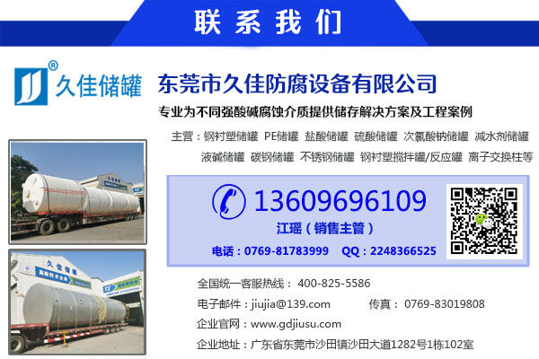 久佳防腐是一家專業生產100立方硝酸儲罐 久塑牌不銹鋼儲罐供應 危廢 化成箔不銹鋼儲罐設備的知名品牌。久佳防腐旗下的儲罐設備適用于危廢處理、環保、化工、水處理、電子、電廠、能源等行業中酸堿鹽腐蝕介質的儲存及中和反應,華南區大型鋼襯塑、PE、不銹鋼、碳鋼儲罐生產廠家。更多聚羧酸儲罐等介質儲存容器資訊,請關注久佳防腐儲罐專注【酸堿鹽腐蝕性介質】防腐容器設計方案。久佳防腐安全儲存25年載,精工產品、卓越品質、服務完善、值得信賴!