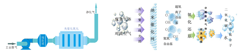 1、利用高能高臭氧紫外線光束分解空氣中的氧分子產生游離氧,即活性氧,因游離氧所攜正負電子不平衡所以需與氧分子結合,進而產生臭氧。UV+O2→O-+O*(活性氧)O+O2→O3(臭氧),眾所周知臭氧對有機物具有極強的氧化作用,對有機氣體及其它刺激性異味有立竿見影的清除效果。有機性氣體利用排風設備輸入到本凈化設備后,運用高能紫外線光束及臭氧對有機(異味)氣體進行協同分解氧化反應,使有機氣體物質其降解轉化成低分子化合物、水和二氧化碳,再通過排風管道排出室外。