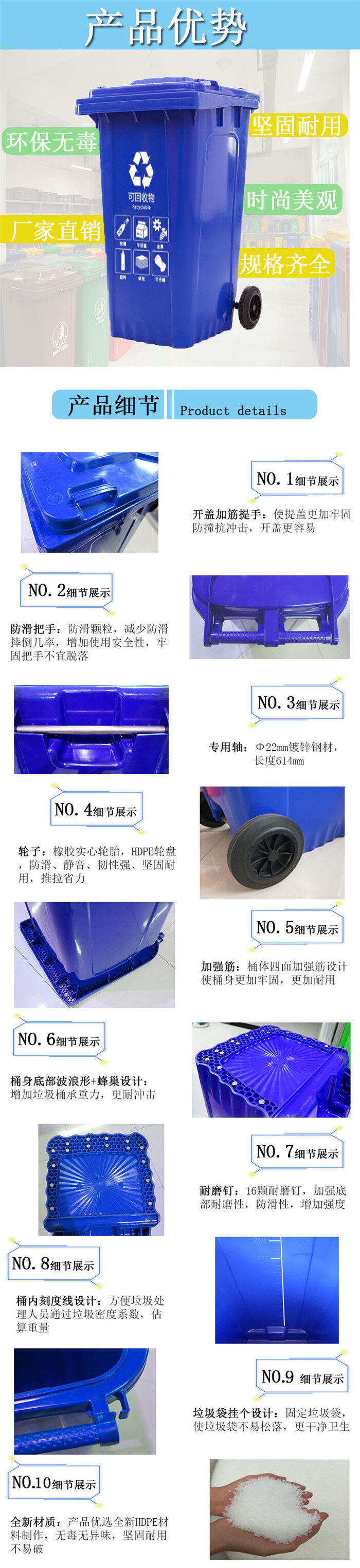 1.更加環保。塑料垃圾桶均采用高密度聚乙烯(HDPE)一次注模成型、減少制作原材料,節省加工時間,降低制作成本,延長了垃圾桶使用壽命。