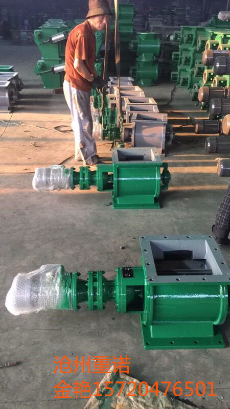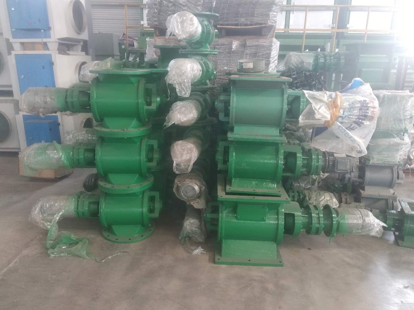 工作原理:星型卸料器工作時,粉塵靠重力落入,充滿上面和側面的星形葉片空格。葉片轉子由電動機通過減速機轉動軸帶動,葉輪轉到下部粉塵靠自重卸下。這種卸塵器一般都安裝在除塵器灰斗下部,為保證連接處的嚴密不漏風,在回轉卸料器的上部應經常保持(儲存)一定高度的粉塵。因為葉輪轉動時,卸完粉塵后葉輪轉上的那一面經常是沒有粉塵的,所以容易使空氣漏入。為了保持一定高度的灰柱,而且不致卸空,*在灰斗內裝設料位信號設施,并與卸塵閥的電動機建立連鎖。