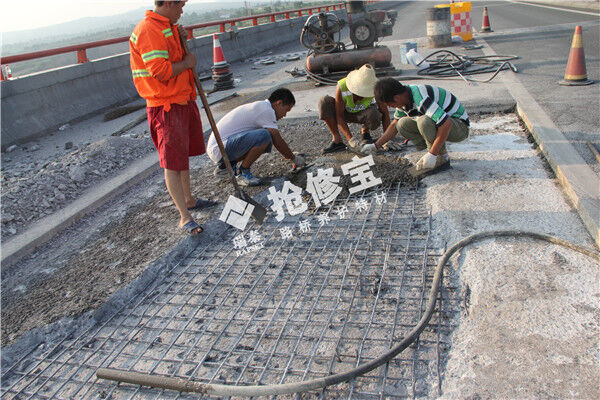由于時間要求快,應采用混凝土特種材料進行搶修,路橋養護特材——搶修寶RT-2,30分鐘速凝,2小時可通行,早期強度高、后期強度不倒縮,粘結能力強,是治理橋梁路面鋪裝層病害常備的特種建材,采用風鎬對鋪裝層病害進行清除,破碎時注意水平方向分離鋪裝層與梁板,不能影響梁板的狀態和質量,對梁板頂要清除整潔,用氣泵或高壓水對梁板頂進行沖洗,不積水不滲漏的情況下,采用搶修寶RT-2特種水泥與標準石子按照要求配比,加水攪拌,迅速澆注到病害部位,抹至與路面齊平時,灑水量水進行收光,指甲掐不動混凝土時進行養護,2小時后即可通行。避免大面積換板,降低了工程成本。施工無需動用大型機械,對交通安全影響不大。