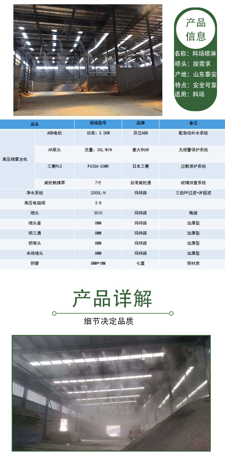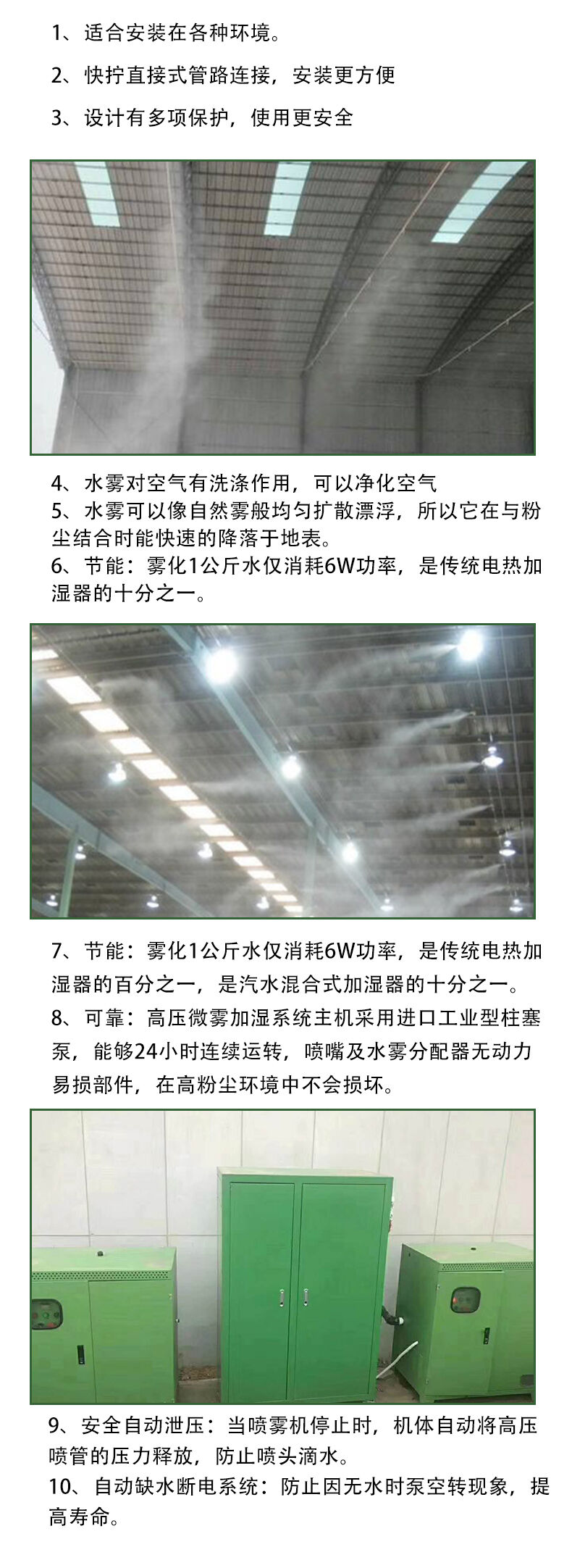 7.可靠:高壓微霧加濕系統主機采用進口工業型柱塞泵,能夠24小時連續運轉,噴嘴及水霧分配器無動力易損部件,在高粉塵環境中不會損壞