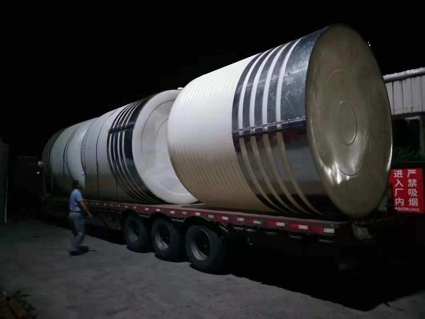 特性三:常壓產(chǎn)品,不可施于超過常壓(1個大氣壓力)以上之正壓或負壓;若需攪拌或酸堿濃度比重在1.2以上時,應加裝補強套及加厚桶體壁厚為宜。此項特性尤其在盛裝容積超過10000L以上的桶體特需注意之。(硫酸、硝酸濃度超過28%一律使用特級產(chǎn)品并加裝補強套)