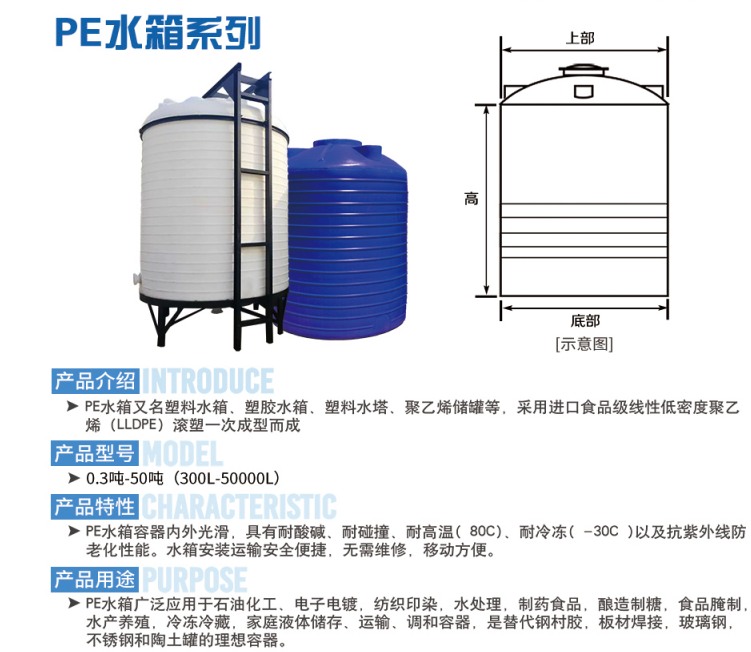 產(chǎn)品由進口滾塑料(PE)生產(chǎn)的PE儲罐,食品級,耐酸堿,防腐蝕,強度好。