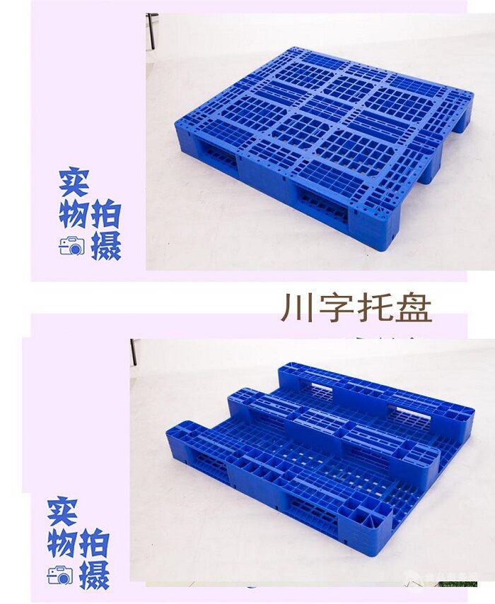 1210川字塑料托盤(加八根鋼管) 尺寸:1200×1100×150mm 進叉形式:四向進叉 適合電動叉車 手動液壓車 底部結構:單面字型 材質:抗沖擊HDPE 進口全新料 靜載:4800kg 動載:1600kg