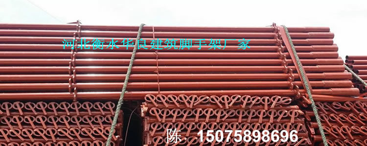 河北衡水華良建筑器材聯系電話:150-7589-8696 ,輪扣腳手架、碗扣腳手架、快拆式腳手架、承插式新型腳手架、直插式腳手架、鋼管腳手架、建筑腳手架,新型建筑支撐,腳手架,模板支撐,新型模板支撐, 新型建筑支撐。這種新型材料的特點是:耐腐蝕,彈性大,堅固不變形。易搭拆腳手架,施工速度快的腳手架。 每根支撐桿可以支撐3-4噸左右,兩根主龍脊之間可以承重2-2.5噸的重量,每根副龍脊可以承重1噸。現在工地現澆水泥一般厚度也就是10-15厘米,同等面積重量最多100-150公斤,所以這個支撐力度一般高層建筑完全夠用。