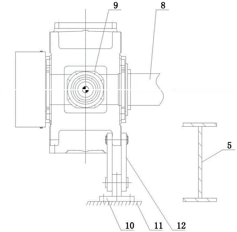 現(xiàn)有的重型板式給料機驅(qū)動機構(gòu)結(jié)構(gòu)如圖2所示,包括驅(qū)動機構(gòu)9,驅(qū)動機構(gòu)9下端設(shè)置扭力臂12,扭力臂12下端設(shè)置有連接座10,連接座10與地基11相連;其驅(qū)動機構(gòu)9與重板主體5之間不相連。由于重型板式給料機工況惡劣、振動較大,驅(qū)動機構(gòu)9單獨與地基11相連,造成驅(qū)動機構(gòu)9的震動與主機的震動不同步,因此,這種不同步的震動對鏈輪軸8傷害較大,嚴(yán)重時可導(dǎo)致鏈輪軸8斷裂。