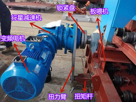 驅(qū)動機構(gòu)由電機、減速機、鎖緊盤和扭力裝置組成,驅(qū)動機構(gòu)通過鎖緊盤帶動鏈輪軸旋轉(zhuǎn),從而對物料進行輸送。為了抵抗驅(qū)動機構(gòu)隨鏈輪軸旋轉(zhuǎn)的力,扭力裝置需要固定在地基上或者機架上。