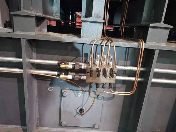 重型板式給料機潤滑系統(tǒng)由儲油罐、油泵、閥門、潤滑管路、油壓傳感變送器和PLC控制器組成。由于板式給料機的潤滑口較多,若采用單一管路同時對各潤滑口注入潤滑脂,不但會使油泵的功率和主管路的壓力增加,而且各潤滑口施加的壓力不均勻,影響潤滑效果。因此,本系統(tǒng)采用分段潤滑的方法,用電磁閥控制各個潤滑管路。該系統(tǒng)有油泵電.機,油壓傳感變送器,潤滑管路總閥門,4個分段潤滑管路分閥門等組成。由于電磁閥安全、控制方便,可靠性高,系統(tǒng)均采用電磁閥。重型板式給礦機自動潤滑系統(tǒng)應(yīng)滿足以下控制要求: