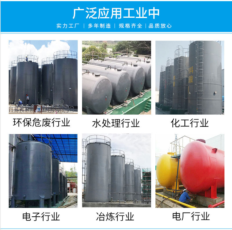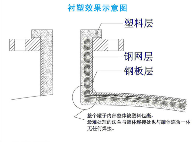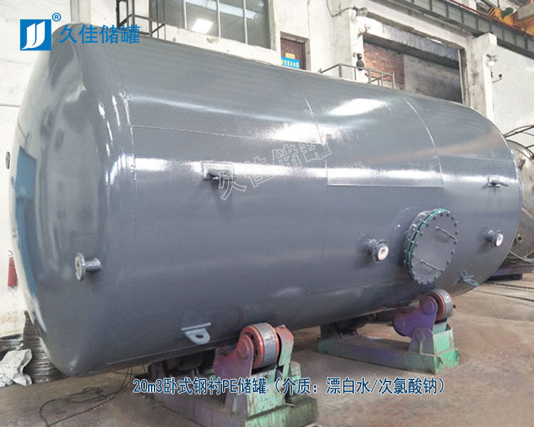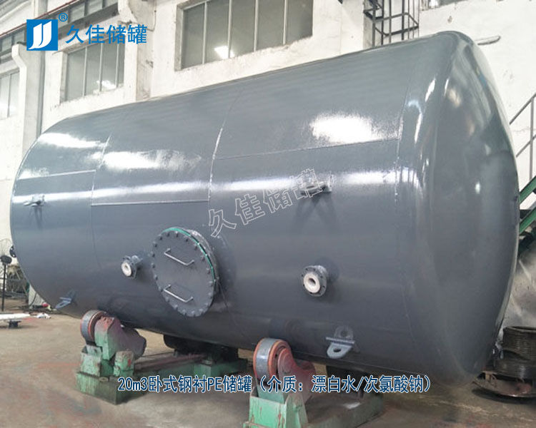 久佳鋼襯聚乙烯儲罐、次氯酸鈉儲罐是以聚乙烯(PE)為原料,采用旋塑工藝(滾塑技術)一次整體成型。將鋼網焊接于鋼體表面,使鋼體表面、鋼、網、塑復合形成一個整體,這種鋼襯聚乙烯儲罐既有高強度物理機械性能又有高強度耐化學腐蝕性能。鋼襯塑產品一般由桶身、平底、封頂、人孔、進料口法蘭、出料口法蘭和液位孔口法蘭組成,臥室鋼襯聚乙烯儲罐通常還有標準鋼質支座。鋼襯塑產品一般根據用戶要求設計制造。產品整體滾襯塑層一次成型,無接縫、堅固耐用、衛生潔凈、耐任何濃度硫酸、氫氟酸、鹽酸、磷酸、稀硝酸、次氯酸鈉溶液等、壽命長、絕緣好,且反應介質不會與金屬離子接觸。具有良好的耐腐蝕、耐磨損、壽命長等優點,是裝運腐蝕液體的理想產品,在化工、稀土、冶金、農藥等行業,用作85度以下的次氯酸鈉儲罐、低壓罐、真空罐、反應釜、交換柱等,深受用戶歡迎。